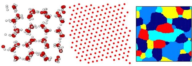 Fig 1: Snapshots from the phase transitions in the TIP4P/Ice model of water, the 2D Lennard Jones model and the Potts model
