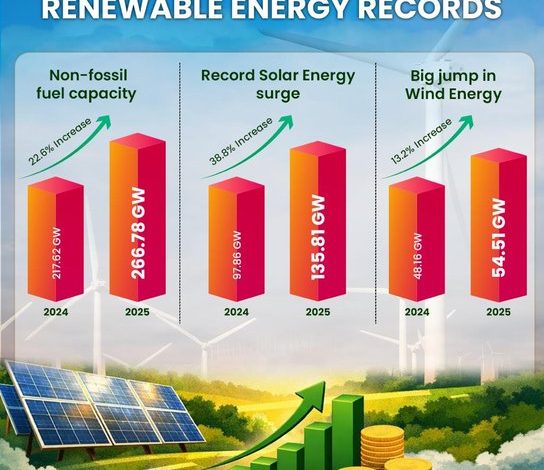 India marked a record-breaking year in its clean energy journey in 2025, with non-fossil fuel installed capacity rising to 266.78 GW, Union Minister of New and Renewable Energy Shri Pralhad Joshi said. This represents a 22.6 per cent increase over 2024, when non-fossil capacity stood at 217.62 GW, with 49.12 GW of new non-fossil capacity added during the year.