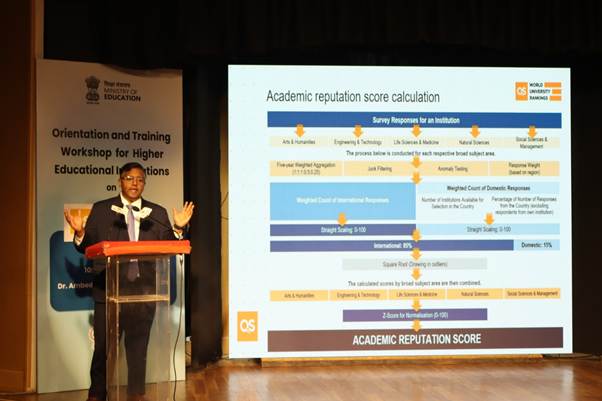 As part of ongoing efforts to enhance the global visibility and performance of Indian Higher Educational Institutions (HEIs), the Ministry of Education organised a half-day Orientation and Training Workshop for Vice-Chancellors and Nodal Officers of HEIs on the QS World University Rankings. The workshop was conducted by QS Quacquarelli Symonds and aimed at improving institutional understanding of global ranking parameters, best practices, and strategic pathways, in alignment with the objectives of the National Education Policy (NEP) 2020.