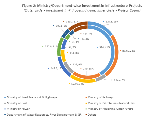- Ministry of Railways is implementing 249 projects (18%), and also commands the largest share of total project cost at ₹8.53 lakh crore (24%).