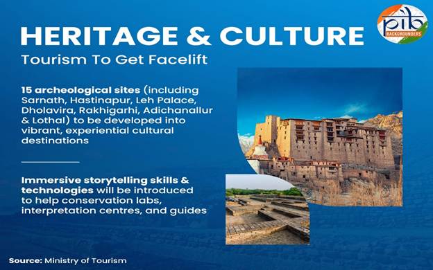 The Budget also proposed development of 15 archaeological sites into vibrant experiential cultural destinations, including Lothal, Dholavira, Rakhigarhi, Sarnath, Hastinapur, and Leh Palace. This will involve the creation of curated walkways, interpretation centres, visitor amenities, and heritage conservation infrastructure to provide immersive experiences for tourists.