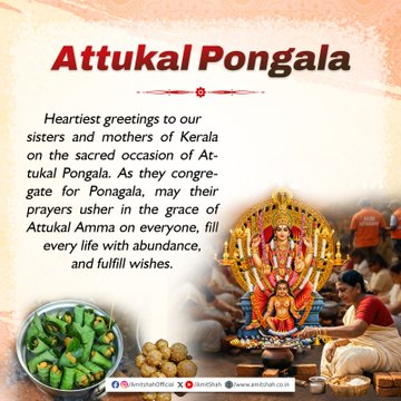 In a post on X, Shri Amit Shah said, “Heartiest greetings to our sisters and mothers of Kerala on the sacred occasion of Attukal Pongala. As they gather to offer Pongala, I pray that their prayers may shower the blessings of Attukal Amma upon everyone, fill every life with prosperity, and fulfill all cherished wishes.”